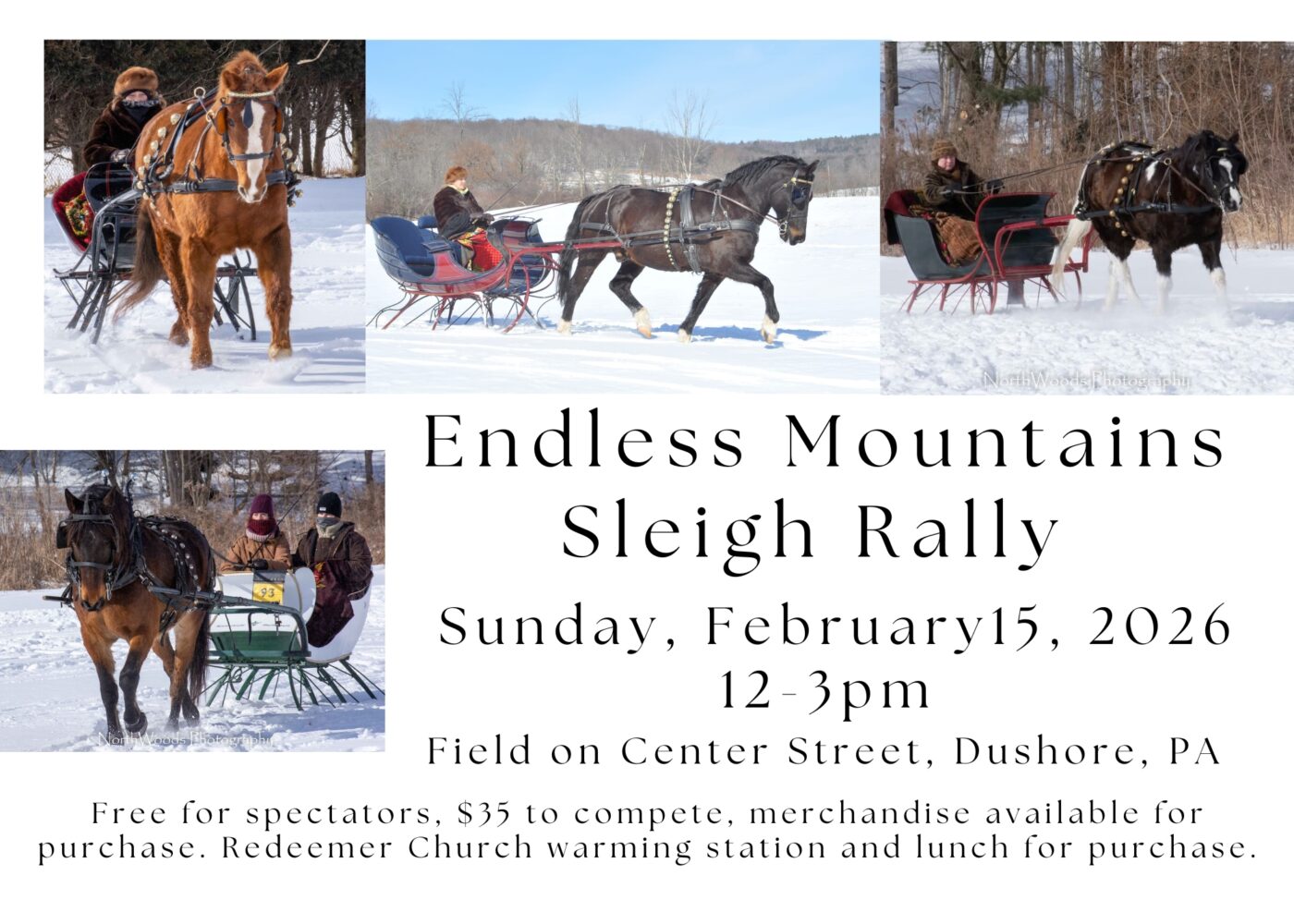 This event is extremely weather dependent. The conditions must be safe enough to trailer horses and then trot them around a field, but we also need frozen ground and 4+inches of snow, with no ice!
